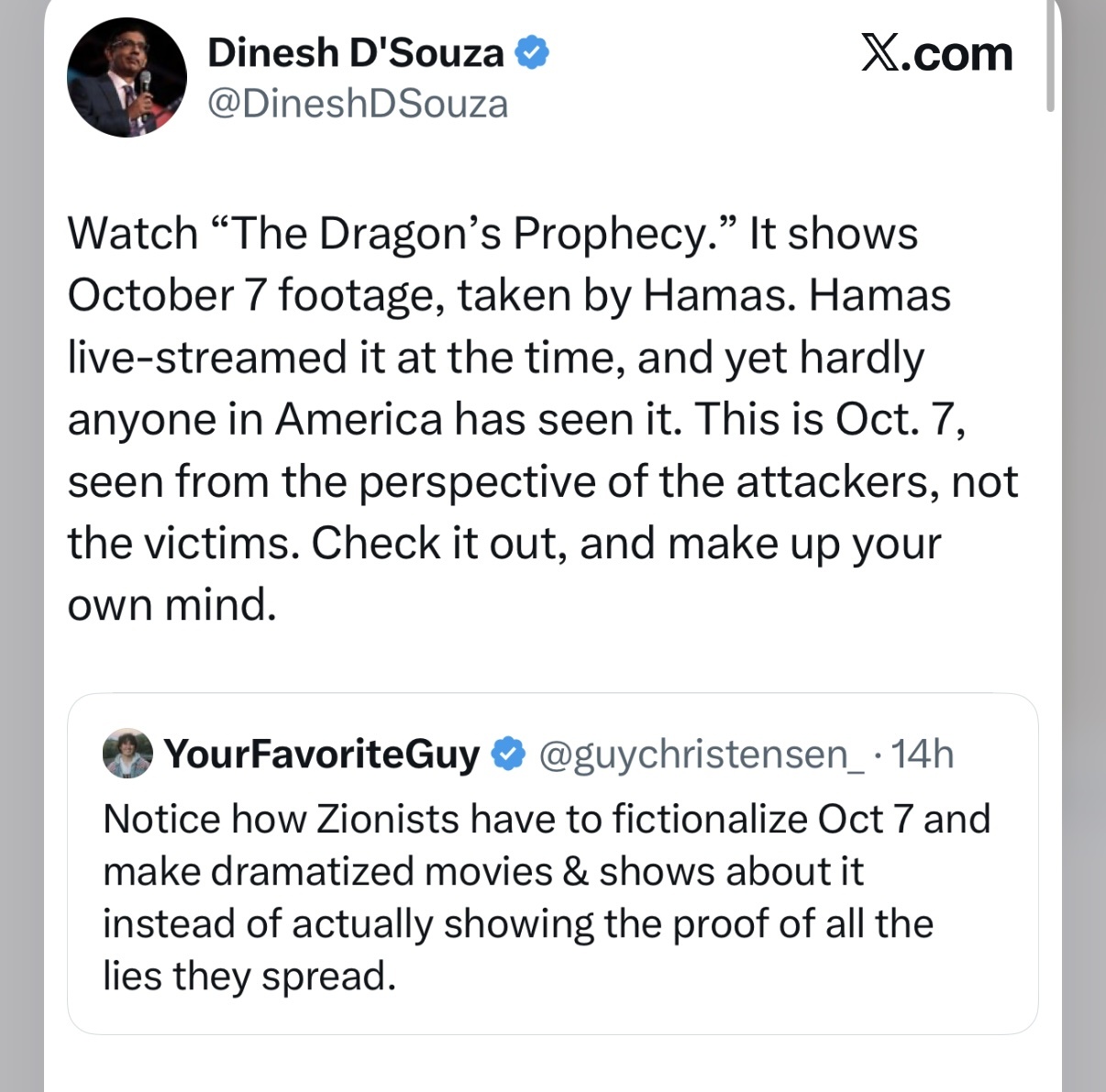 I have a lot of respect for @DineshDSouza and agree we need to support Israel. That said, its seems clear that Israel is corrupt. They do themselves no favors when they buy of influencers and lie about it, fund Hamas through Qatar and then act like that program was unrelated to Oct 7, manipulate American politicians through lobbying organizations and pretend it is not obvious, or many of the other things they are doing. These are the kind of things that have people like @TuckerCarlson so fired up.