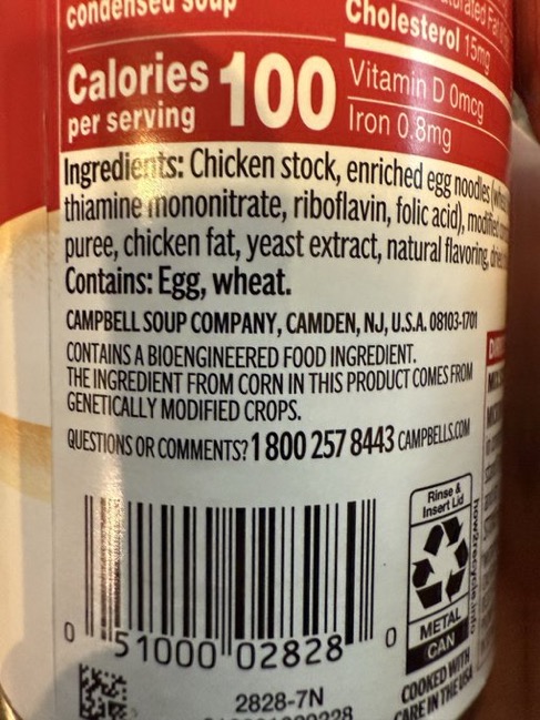Campbell’s Soup ingredient list includes “a bio-engineered food ingredient” and an “ingredient” from corn that comes from “generically modified crops.” They then sell this to schools to feed our kids.