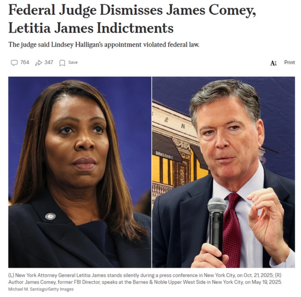 BREAKING: The DOJ strikes again - cases against Comey and Letitia James have been dismissed.