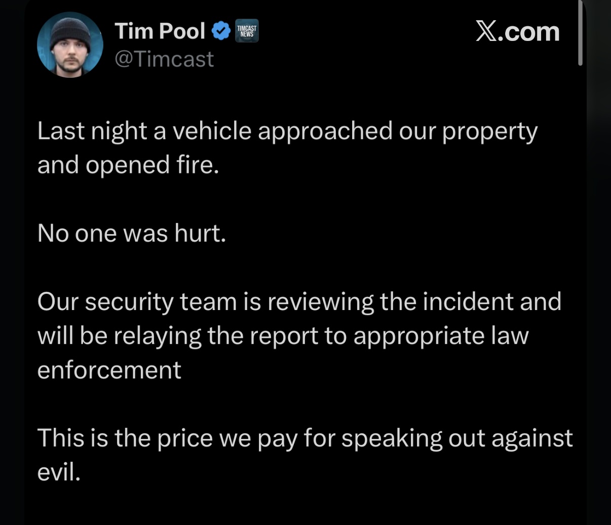 The push by Soros and the globalist cabal to destabilize America is working. @timcast was attacked with gunfire for no reason other than they speak truth to power.