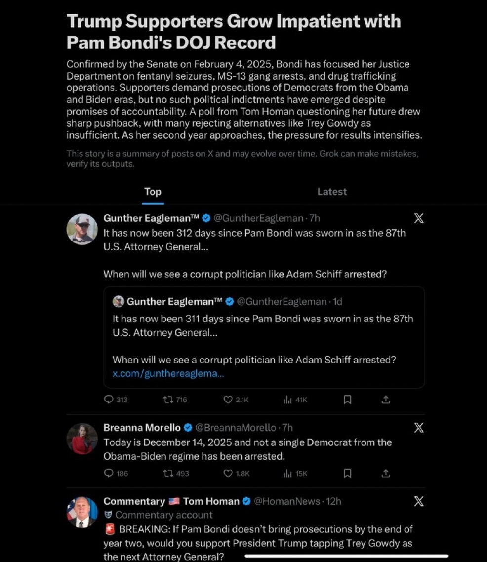 We the people are sick of excuses and no results. There are no prosecutions or accountability for the people destroying America because the DOJ and Pam Bondi choose not to investigate and prosecute them. They don’t need more time; it’s not a lack of evidence; it isn’t that there aren’t good cases—it is 100% because they do not want to hold these crooks accountable.