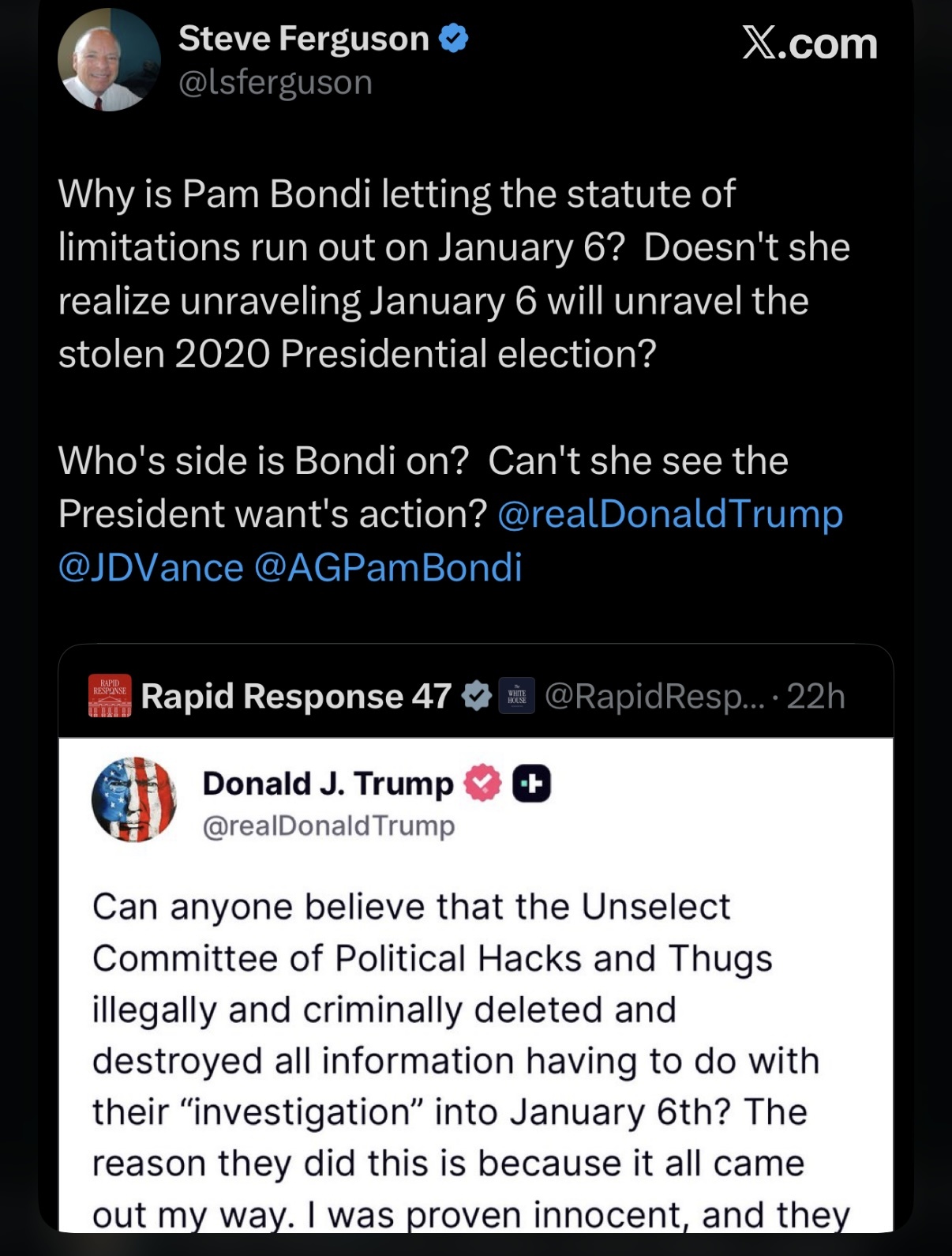 The reason Pam Bondi is letting the statute of limitations run out on the Democratic and leftist crooks behind J6 is that’s part of what Susie Wiles hired her to do.