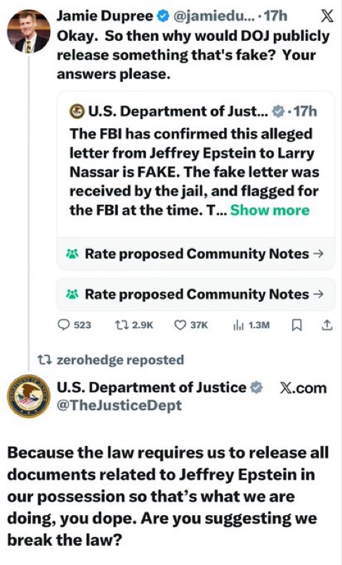 In an exchange, a person named Jamie asked why the DOJ would release documents it knows are fake. The DOJ social media account snarkily responded by calling Jamie a “dope.”