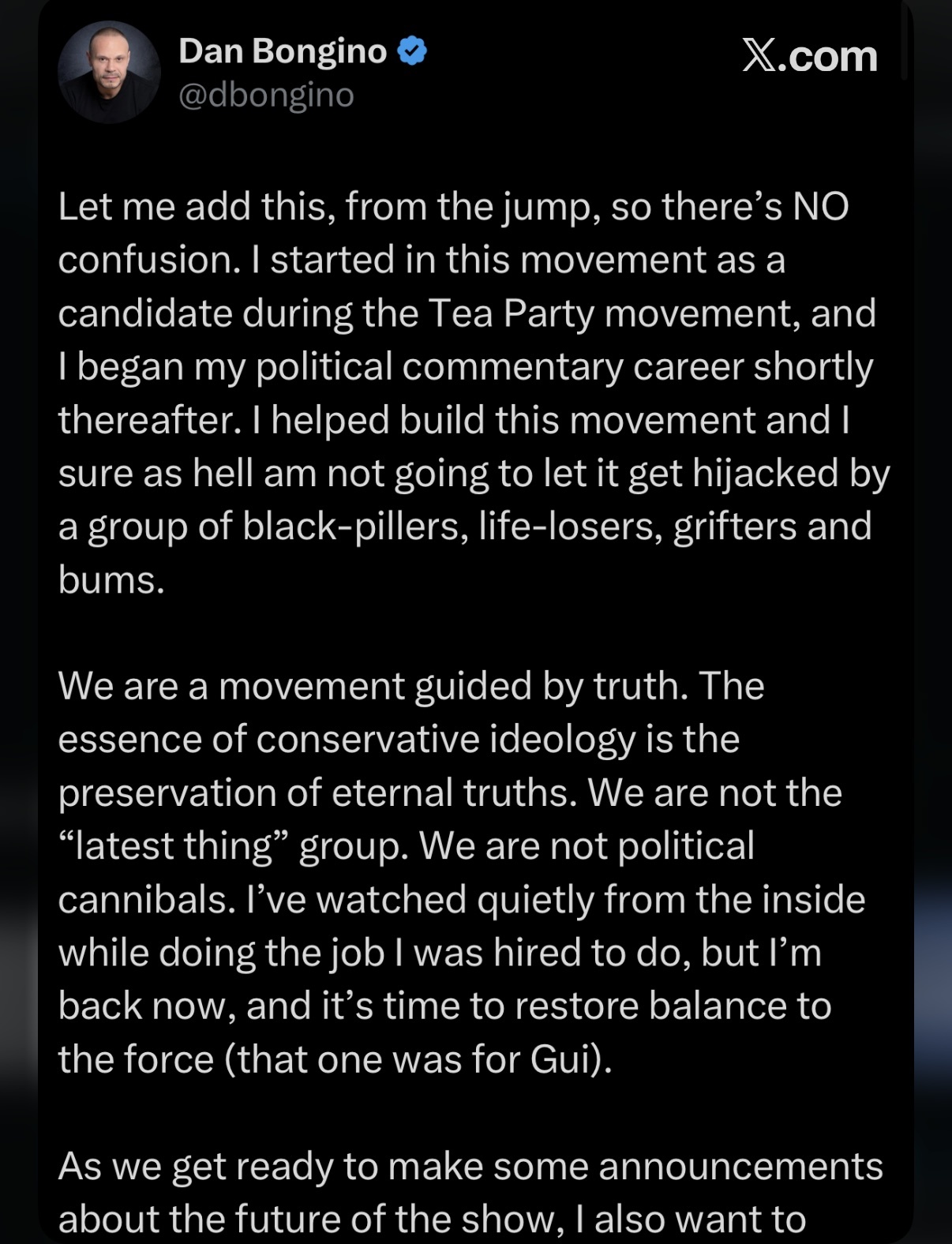 Is Bongino part of the Wiles and Bondi social media smear campaign that @TrueGenFlynn broke with @AlexJones ? Is calling someone a "blackpiller" the new RINO version of calling someone a misinfo or disinfo pusher?