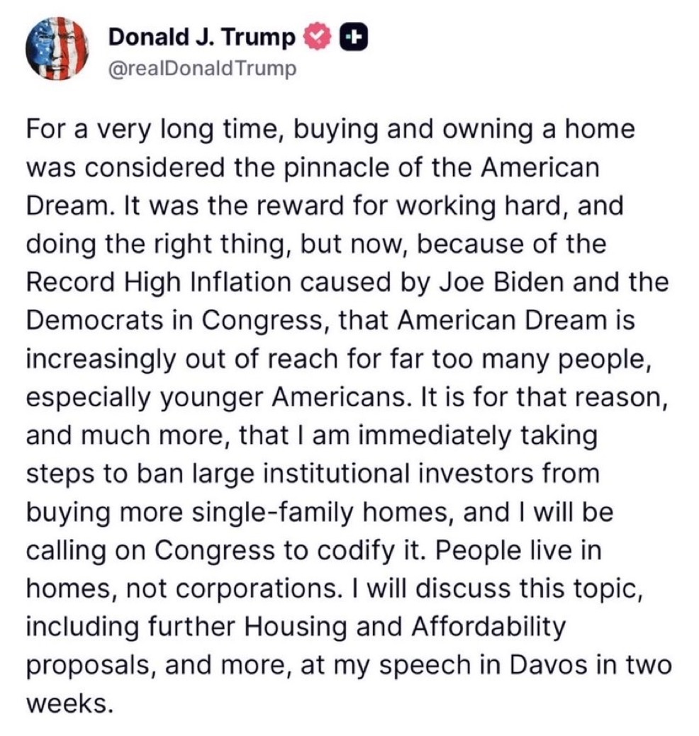 This is a great move by @realDonaldTrump . Homeownership is huge and foundational to our economy. Stopping BlackRock and Vanguard from buying all the homes and leasing them back to people just creates a permanent class of indentured servants.