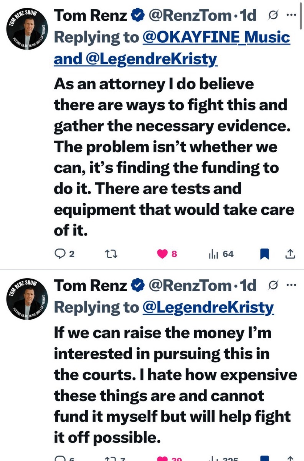 Donate: We are a nation of 320 million. If 100,000 would give $20 per month we could wage lawfare on a scale never seen. If you give to our GiveSendGo https://www.givesendgo.com/renzlaw or join our community of Renz Warriors at www.TomRenz.com we will use that money to help make that fight happen. For less than the cost of a Starbucks Coffee per week we can fight to change our nation.