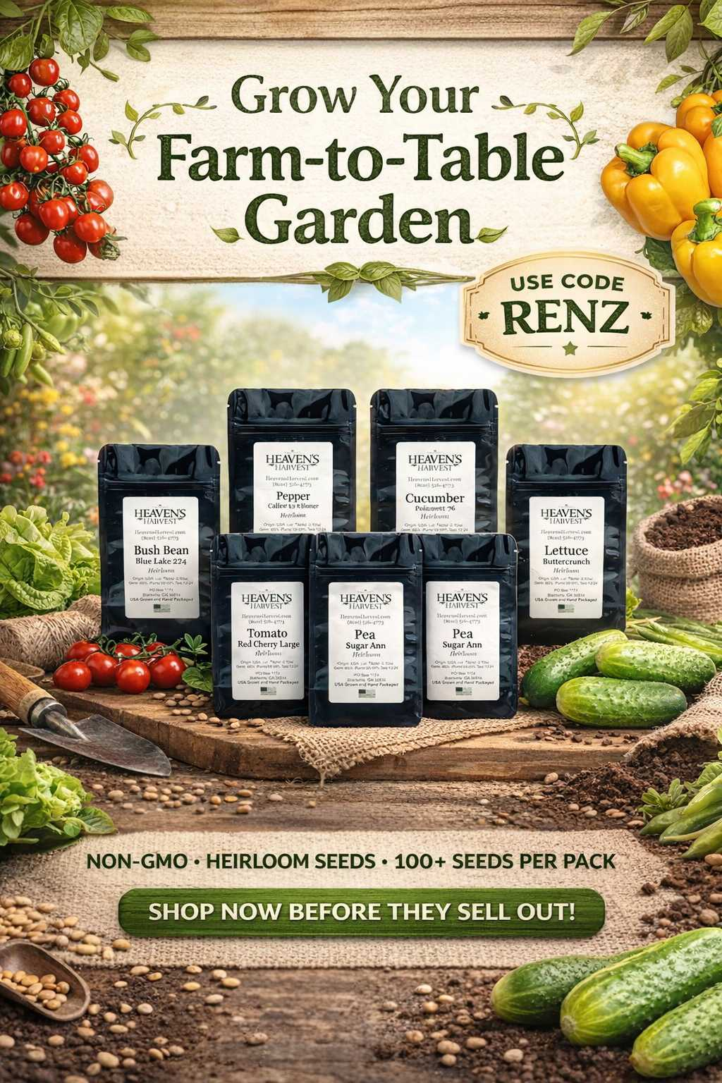 đŸŒ± Grow your own fresh, nutrient-rich farm-to-table meals with this Heirloom Seed Starter Kit. Each kit includes 6 easy-to-grow, open-pollinated, non-GMO varieties: Bush Beans, Slicing Cucumbers, Buttercrunch Lettuce, Peas, Green Peppers, and Cherry Tomatoes — 100+ seeds in every pack.