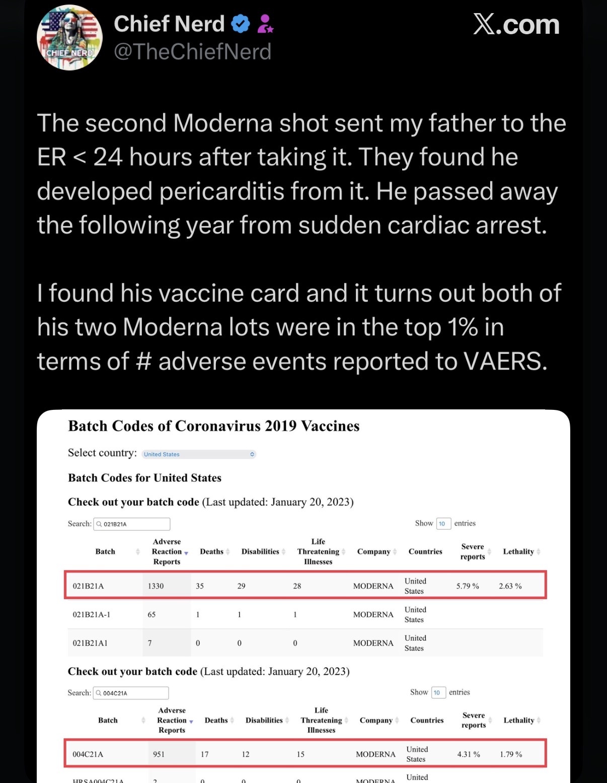 This post by @TheChiefNerd talks about another tragic side effect from the deadly Moderna mRNA “vaccines,” but here’s the problem, why are the adverse event rates of the lots so dramatically different?