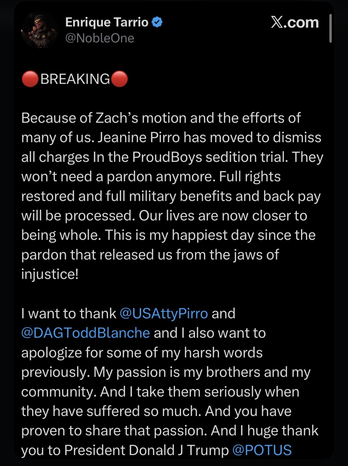 This is long overdue but I’m grateful to see the charges against the Proud Boys for sedition dismissed. Now we need to go after the Democrats behind the J6 setup.