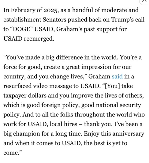 Lindsey Graham pushed USAID despite the fact that it was funding tertiary groups like Hamas. Mark Levin - The only person on the planet that might be as excited about the Iran war as Disney Princess Lindsey Graham has endorsed Graham. This is a racket.